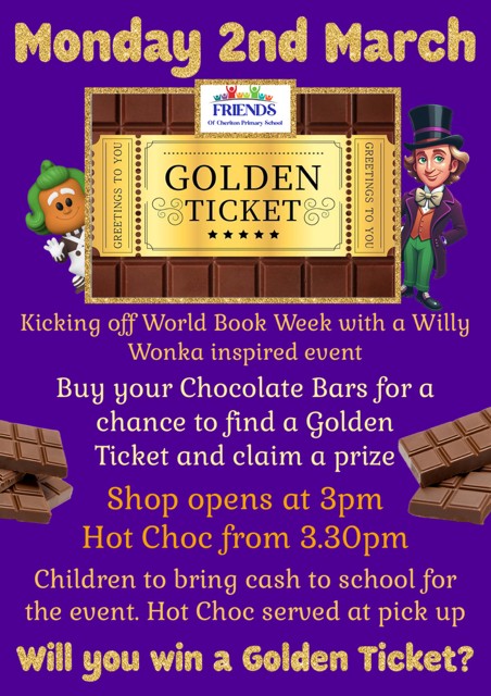 Children to come to school dressed in their Pyjamas for £1 donation. From 3.00pm they have a chance to find a Golden Ticket in our Friends chocolate bars followed by Hot Chocolate at 3.30pm